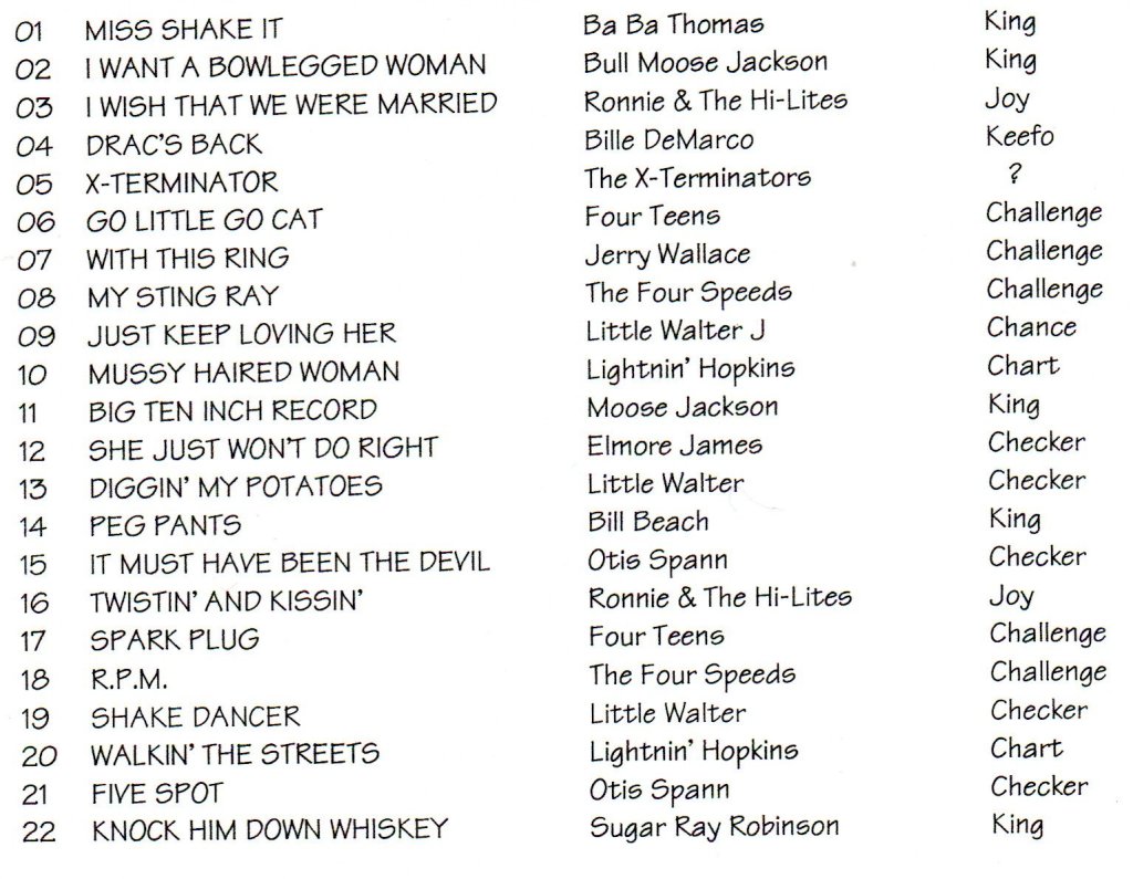 My “Amos 1” is just one cd. It has 24 tracks, with Walter Brown’s “Alley Cat” being the first and Leroy Washington’s “Wild Cherry” being the last.